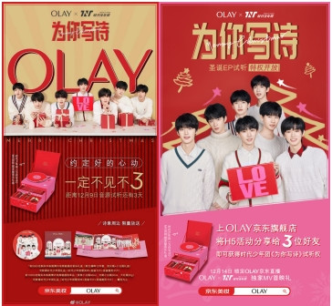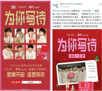 此次活動時間跨度較長,足以見得OLAY對其的用心程度。從12月初便開始籌備,前期先在OLAY官方微博預(yù)告時代少年團全新mv海報,帥氣的少年們吸引了大批粉絲,為后期直播蓄力積攢人氣,粉絲可觀的消費力引爆旗艦店的流量。