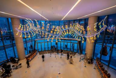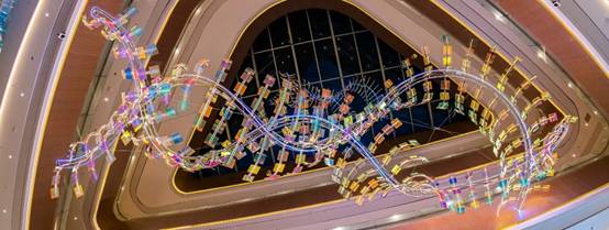 “奔流”,兩道流線型鋼結構龍骨蜿蜒交錯,配合延伸而出的幻彩亮片打造視覺主體,形成連綿潮汐奔流不止的自然景象。