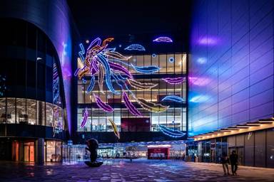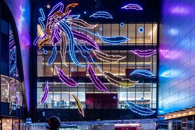 商場連廊立面巨幅燈飾畫“羽禮相遇”,由五彩斑斕的羽毛從禮盒中迸發飄散。