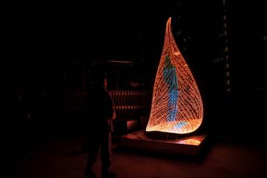 其以紅外感應技術與點陣式顯示屏結合,可在互動屏上同步“模仿”出打卡拍照者相應的動作路徑,十分有趣。