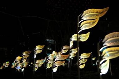 在下沉廣場的綠植區域,策劃設計團隊設計了“幻彩羽筆”的燈光裝置,猶如一只只羽毛筆,在燈光變幻間,“書寫”著一則則在天河城發生的關于夢想生活的故事。