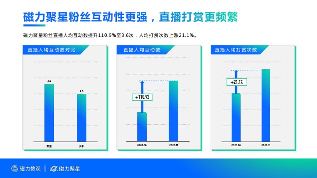 如何讓品牌的投放真正做到有聲響?粉絲活躍度是諸多品牌考量的因素。《報告》顯示,磁力聚星粉絲點贊數、分享數和短視頻完播率均有提升,直播人均互動數提升110.9%,人均打賞次數上漲21.1%,互動性更強。