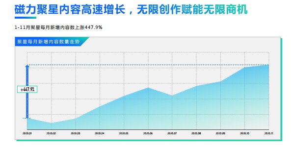 創作者的持續增長也帶來了創作內容的欣欣向榮。2020年1-11月,聚星內容高速增長,每月新增內容數上漲高達447.9%,蘊藏了無限創意潛力和無限商機。