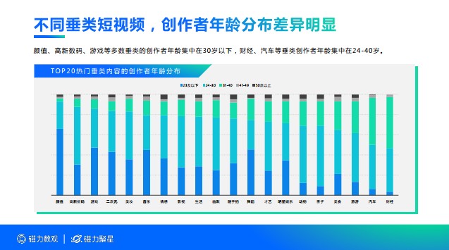 其中,短視頻發布數量增長強勢,2020年6-11月,發布量提升達142.8%。并且短視頻內容覆蓋影視、游戲、高新數碼、二次元、汽車等多個垂直領域,不同垂類的創作者畫像在性別、年齡等層面差異化明顯。如顏值、高新數碼、游戲等多數垂類的創作者年齡集中在30歲以下,財經、汽車等垂類創作者年齡集中在24-40歲。