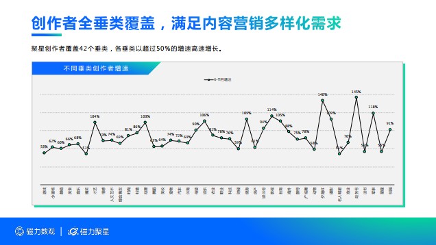 《報告》顯示,2020年1月到11月,聚星創作者數量上漲達181.1%,不同粉絲量級的創作者數量均有增長,并覆蓋娛樂、動漫、才藝、政務等42個垂類領域,讓不同行業品牌都能找到目標圈層,有更豐富的排列組合方式進行選擇,滿足多樣化的營銷需求。