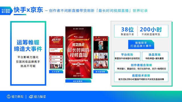 受疫情影響,2020年線下營銷場景被迫停擺,在這樣的背景下,線上直播也成為了營銷新風口,變成品牌挖掘市場增量的有力武器。在這一方面,快手磁力聚星強勢領跑,11月直播場次對比6月上漲32.8%,直播均場時長上漲60.4%,做到直播高頻且時“長”。例如,在與京東的合作中,38位聚星創作者不間斷直播帶貨200小時,成功挑戰最長時間的視頻直播,花式內容也讓不同品牌在直播中探索全新可能,找到適合自己的傳播姿態。