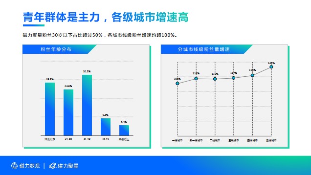 近兩年,眾多品牌紛紛選擇在短視頻平臺快手上進行品牌和營銷活動,也是看中其平臺上的用戶群體與當下的目標消費群體高度重合,為商業價值變現提供了源頭活水。《報告》顯示,磁力聚星粉絲以青年群體為主,30歲以下粉絲占比超50%,并且各城市線級粉絲增速均超過100%,五線城市粉絲增速尤為迅猛。