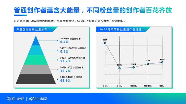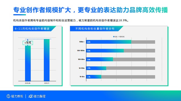 除了普通創作者,快手上專業創作者的力量也不容小覷。2020年6-11月,磁力聚星的機構類創作者增速達18.9%,粉絲量為1000w+的創作者中機構號占比達66%,展現出機構創作者在品牌傳播方面的權威性和專業度,而越來越多創作者也選擇在短視頻內容創作的基礎上開通直播,做到種草帶貨兩不誤。
