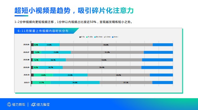 當下,用戶注意力越來越碎片化的消費趨勢也不容忽視,《報告》顯示,快手上1-2分鐘視頻向更短視頻遷移,1分鐘以內視頻占比近半數,通過越發精煉短小的視頻形態,快手成功收割用戶被打碎的注意力。