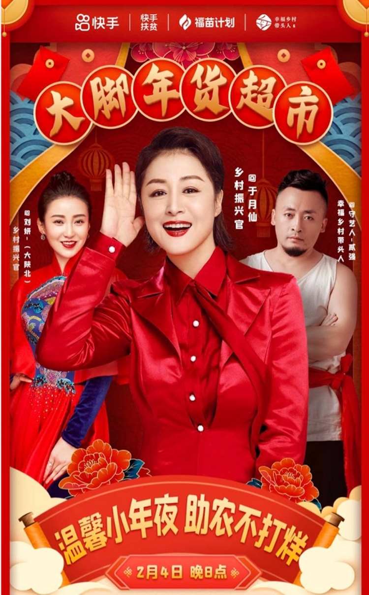 2月4日小年夜之際,“大腳年貨超市”在快手開張,《鄉(xiāng)村愛情》中“謝大腳”扮演者于月仙與快手幸福鄉(xiāng)村帶頭人、鄉(xiāng)村振興官進行了一場別開生面的助農(nóng)愛心直播。多款來自幸福鄉(xiāng)村帶頭人的農(nóng)家好物亮相“快手年貨鋪”。當(dāng)晚,直播間還上演了一場極具陜北特色的小年夜晚會。