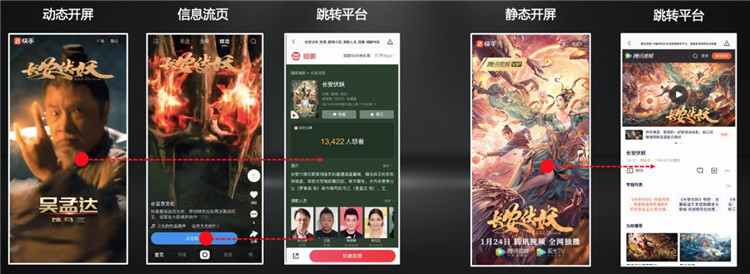 當《長安伏妖》在達人和話題側獲得海量討論后,劇組聯動快手磁力引擎做全平臺流量收割,利用開屏廣告在院線和平臺上映兩個階段占據老鐵心智。1月8日,電影院線上映,《長安伏妖》在快手投放eyemax開屏,透過更震撼的視覺呈現、更沉浸的體驗,使得傳播效果遠超預期,并且自帶一鍵跳轉購票,進行轉化。到了24日,電影視頻平臺上映,《長安伏妖》則通過靜態開屏,簡潔有力的告知電影上線長視頻平臺,用戶只需輕輕點擊,就一鍵跳轉觀看影片,通過這一系列大曝光,宣發隨即進入了爆發期。