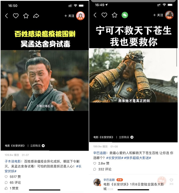 一條吳孟達舍身試毒,試圖拯救被朝廷圍剿的百姓的視頻,則在快手引起了大量的討論,一時間,“感染了病毒競異化成妖”、“救心愛的人和解救天下蒼生百姓”等高燃片段也在快手瘋傳發酵起來,這就是《長安伏妖》聯合快手磁力引擎做的一連串宣發動作。