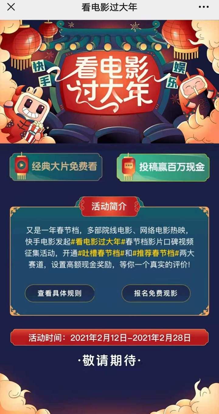 據悉,本次征稿活動將于2月12日正式開啟,2月28日結束。主要分為兩大賽道:#吐槽春節檔#&#推薦春節檔#,好看你就傾情推薦,難看你就盡情吐槽!看完春節檔的影片以后,觀眾們只需通過快手App拍攝并上傳可表達自己對相關影片喜愛與否的原創視頻,并添加#看電影過大年#及#吐槽春節檔#或者#推薦春節檔#標簽話題公開發布,即可視為參賽。
