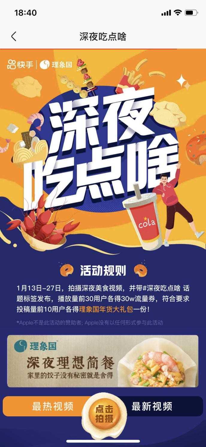 一頓理想的簡餐是理象國的品牌目標(biāo),而“猶如現(xiàn)包,不像速凍”是理象國水餃的最大特色。通過IP授權(quán),理象國在#深夜吃點(diǎn)啥#話題頁強(qiáng)勢(shì)露出,由快手美食達(dá)人率先發(fā)布短視頻預(yù)熱,以深夜花式烹飪、家庭場(chǎng)景化表達(dá)等形式巧妙植入產(chǎn)品賣點(diǎn)。有調(diào)性、夠?qū)I(yè)、高品質(zhì)的內(nèi)容,瞬間激發(fā)用戶的參與感和創(chuàng)作欲,高效實(shí)現(xiàn)營銷破局。