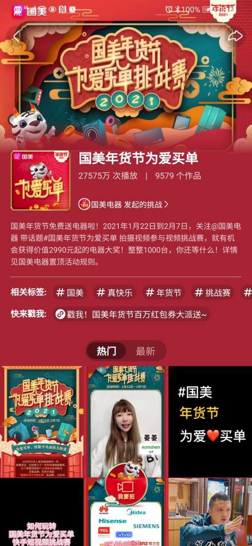 隨著社交+娛樂化消費潮流趨勢異軍突起,國美在2021年1月重磅推出全新娛樂化、社交化新零售平臺“真快樂”APP。恰逢傳統春節到來,國美策劃新春重磅活動“國美年貨節”,為了更好的為活動引流,給更多人展示國美煥然一新的品牌形象,國美繼“雙十一”合作后,再度攜手快手磁力引擎啟動年貨節營銷。本次活動充分利用快手自身平臺優勢,打出“熱議話題挑戰+王牌主播PK”的殺手锏,成功助力此次國美年貨節主題活動營銷。