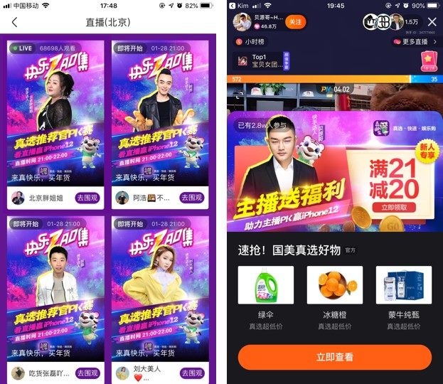 活動期間,國美在快手平臺還發起名為“快樂zao集,真選推薦官PK賽”的直播PK賽,邀請@蒙安夫婦、@北京胖姐姐 等數位快手達人,通過直播為“真快樂”APP舉辦的年貨節主題活動引流,領取專屬優惠券,同時通過直播人氣榜單PK,爭搶真選推薦官,為自己的粉絲爭取直播間超級大獎。本次活動集結快手頭/腰部網紅達人,通過快手直播PK賽創新玩法,聯手制造出行業具有影響力的直播帶年貨PK事件。