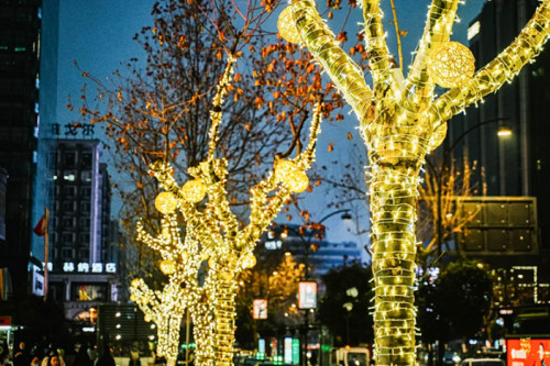 為增加新春氛圍,我們用星光燈環繞樹間,點綴上火花球,讓來往消費者猶如置身星光銀河當中。