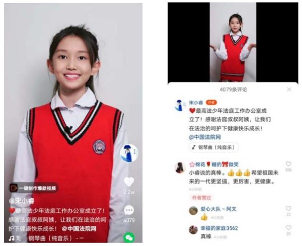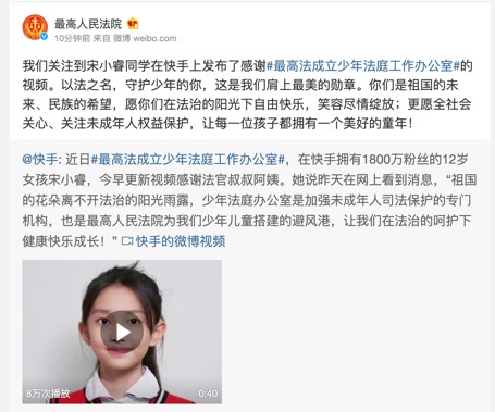 3月3日早上,擁有超1800萬粉絲的快手小音樂人@宋小睿(ID:190367)發布了一則視頻,對少年法庭辦公室的成立點贊:“祖國的花朵,離不開法治的陽光雨露。少年法庭辦公室是加強未成年人司法保護的專門機構,也是最高人民法院為我們少年兒童搭建的‘避風港’。感謝法官叔叔阿姨,讓我們可以在法治的呵護下,更加健康快樂的成長!”