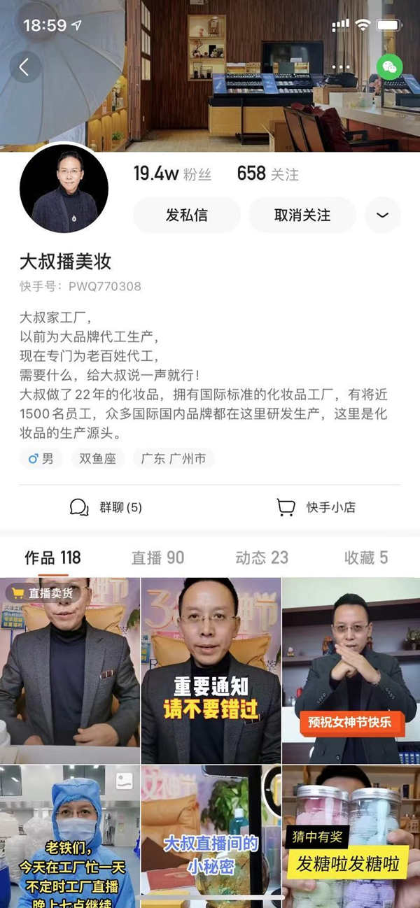 經過和股東們討論,龐文強開始了自己“主播”生涯。他形象得體,表達能力好,時常跟辦公室的年輕人拍攝短情景劇廣告,屬于有一定網感的中年大叔。他給自己的快手賬號取名就叫做“大叔播美妝”。