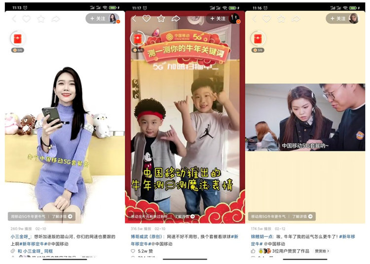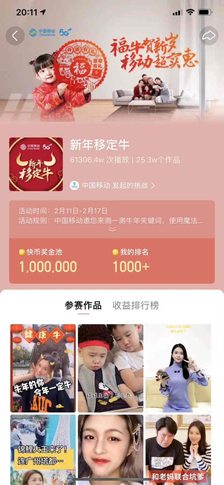 在本次挑戰(zhàn)賽中,快手磁力引擎為中國移動定制“牛年測一測”專屬魔法表情,將“用中國移動5G,牛年更牛氣”巧妙植入用戶新春場景。快手達人號召與多元流量入口加持,為品牌傳播持續(xù)升溫,#新年移定牛#挑戰(zhàn)賽收到25萬+作品、狂攬超6億播放量,為通信運營商品牌打造出一個創(chuàng)新營銷標桿。