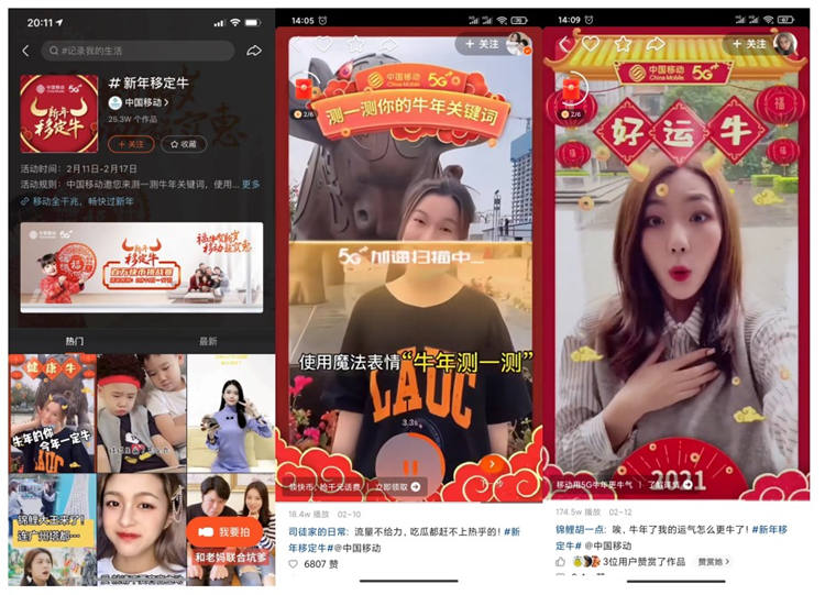 春節(jié)對每個中國人來說都具有重要意義,也是品牌商們爭相追捧的節(jié)日營銷熱點。今年春節(jié),中國移動與快手磁力引擎大玩創(chuàng)新,將新春祈福傳統(tǒng)與“互聯(lián)網(wǎng)迎春”結合,聯(lián)手發(fā)起#新年移定牛#挑戰(zhàn)賽,通過巧妙的方式打造一起春節(jié)趣味營銷案例。