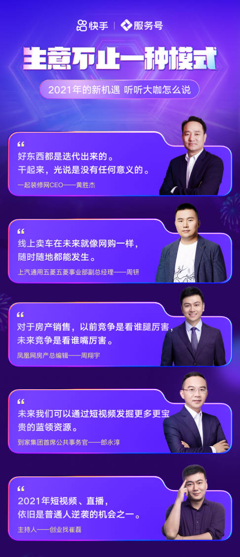本次直播聚焦“生意不止一種模式”的主題,以一個個實例說明在創(chuàng)作者們的多元化創(chuàng)作中,短視頻和直播所傳遞的不僅是內(nèi)容本身,更創(chuàng)造出了多種新消費(fèi)場景,也讓身為短視頻內(nèi)容承載體、傳遞者的快手構(gòu)建起了“短視頻+直播”的新消費(fèi)生態(tài)。