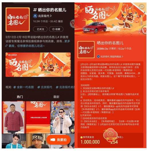 優質UGC內容,是挑戰賽模式核心的流量來源。明星與達人的號召之外,專屬魔表為用戶創作提供低門檻與大空間,引發快手用戶使用魔表曬出各種名圖兒,留下獨家新春記憶與美好期盼。此外,為激發用戶參與,北京現代還帶來新車使用權與瓜分快幣的互動福利,進一步放大挑戰賽的活動效能。截至活動結束,挑戰賽收獲10.2萬+作品,視頻播放量高達20.4億,海量UGC內容助力品牌聲量顯著擴大,使新車種草能力瞬間Max。