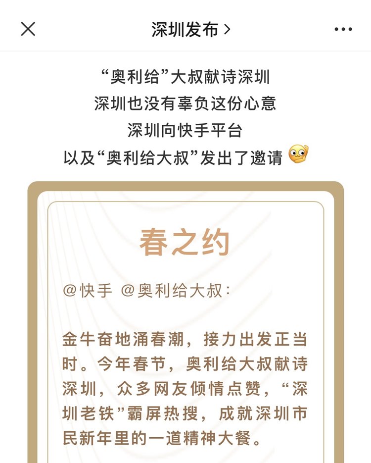 深圳在這篇名為《春之約》的邀約信里寫道:感謝“奧利給大叔”送深圳“奧利給”, 感謝快手這一有溫度的平臺,讓無數在深的和不在深的勵志奮斗者有機會被看見,成為一個溫暖的橋梁。誠邀快手及“奧利給大叔”去深圳,尋找春天的故事,與新時代深圳精神同頻共振,一同前行。