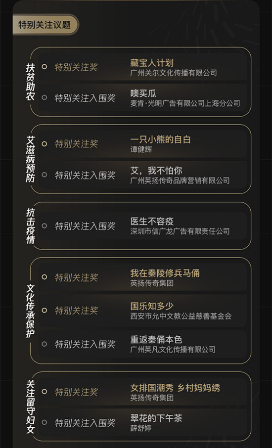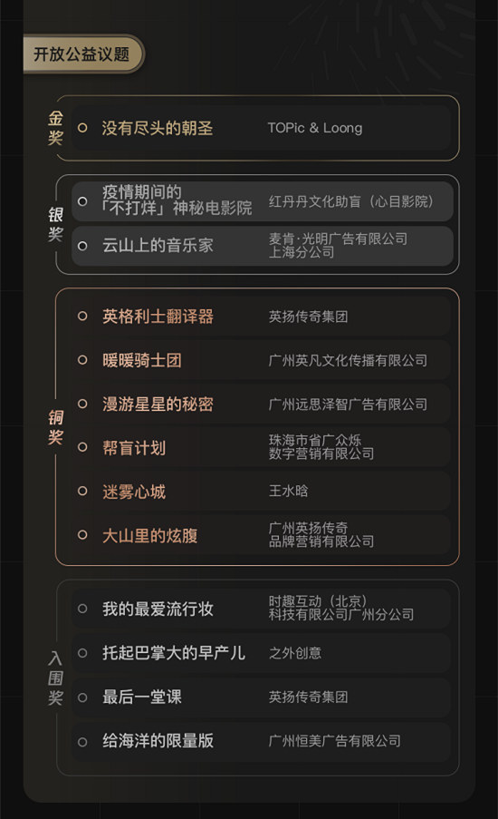 “我是創(chuàng)益人”公益廣告大賽行至今天,已經(jīng)走過(guò)了四個(gè)年頭。大賽“創(chuàng)意+科技+公益”的融合機(jī)制,匯聚社會(huì)各界力量,孵化了194支富有實(shí)效的公益?zhèn)鞑グ咐瑏?lái)自公益組織、創(chuàng)意和設(shè)計(jì)圈層、政府團(tuán)隊(duì)、協(xié)會(huì)組織、品牌和企業(yè)的4600個(gè)團(tuán)隊(duì)、近1.4萬(wàn)人陸續(xù)成為“創(chuàng)益人”,讓2.2億人的力量凝聚在公益事業(yè)的迭代進(jìn)程里,大賽或改變了他們的觀念,或?yàn)樗麄儙?lái)了認(rèn)識(shí)新議題的可能,更吸引他們切實(shí)行動(dòng)起來(lái),參與人人公益。