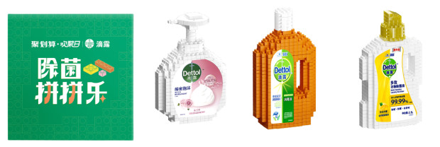 除了別具一格的除菌課本,禮盒里還附贈了滴露三款主打產(chǎn)品的微顆粒積木。消費(fèi)者可以自己動手拼裝,在重溫童年樂趣的同時也再一次加深了對于滴露產(chǎn)品的印象,將產(chǎn)品的功能利益點(diǎn)銘記于心。