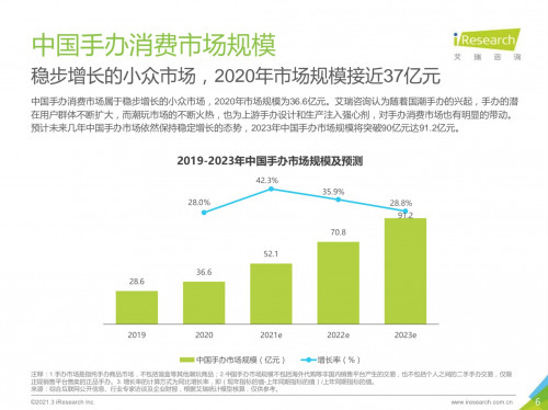 4月22日,B站會員購聯(lián)合艾瑞咨詢發(fā)布《中國Z世代手辦消費趨勢研究報告》(以下簡稱《研究報告》)稱,中國手辦消費市場屬于穩(wěn)步增長的小眾市場,2020年市場規(guī)模為36.6億元,預(yù)計2023年中國手辦市場規(guī)模還將達91.2億元。