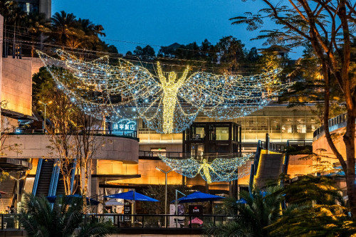 當夜幕降臨,“天使”雕塑點亮的瞬間,不同的動作姿態在燈光匯聚效果下呈現出唯美效果,吸引著人們走進一場美輪美奐的“天使之夜”,邀請人們走進四海城,體驗“全天候購物公園”的魅力。