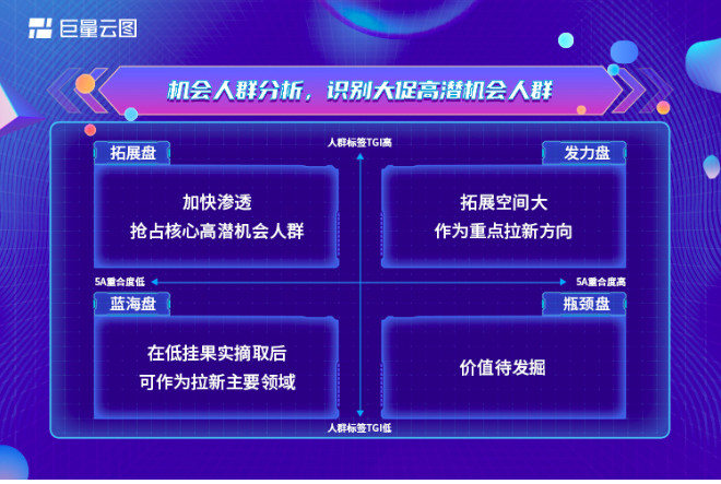 在品牌廣告需要保量的前提下,有拓新的需求,卻沒(méi)有明確的拓新方向,怎么辦?巨量云圖同樣可為其提供機(jī)會(huì)人群分析的入口。巨量云圖的機(jī)會(huì)人群分析框架將不同的人群細(xì)分為發(fā)力盤(pán)、拓展盤(pán)、藍(lán)海盤(pán)、瓶頸盤(pán)四個(gè)區(qū)域,并能識(shí)別不同人群的5A品牌重合度。通過(guò)結(jié)合人群畫(huà)像TGI,一方面可精準(zhǔn)識(shí)別這部分機(jī)會(huì)人群是否貼近品牌TA,另一方面也可識(shí)別其是否可以作為拓新發(fā)力的方向。