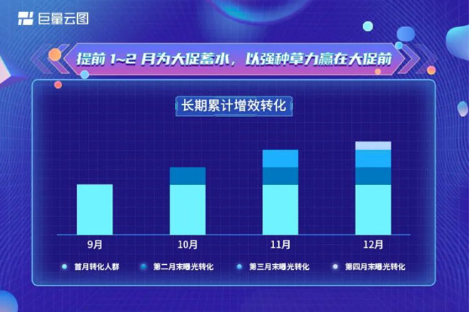 根據(jù)長(zhǎng)期增效實(shí)驗(yàn),巨量云圖發(fā)現(xiàn),品牌商家首月觸達(dá)人群即使在未來(lái)的三個(gè)月不做曝光,也仍然會(huì)有持續(xù)的轉(zhuǎn)化率。當(dāng)月?tīng)I(yíng)銷所產(chǎn)生的轉(zhuǎn)化,其實(shí)只占長(zhǎng)期帶來(lái)的所有轉(zhuǎn)化的60~70%。這意味著,為了贏在618這樣關(guān)鍵大促節(jié)點(diǎn),商家必須提前做好充分的人群準(zhǔn)備,讓長(zhǎng)期增效的價(jià)值恰好落在大促節(jié)點(diǎn),再結(jié)合大促或營(yíng)銷節(jié)點(diǎn)期間的投放,從而讓整個(gè)活動(dòng)的銷量最大化。