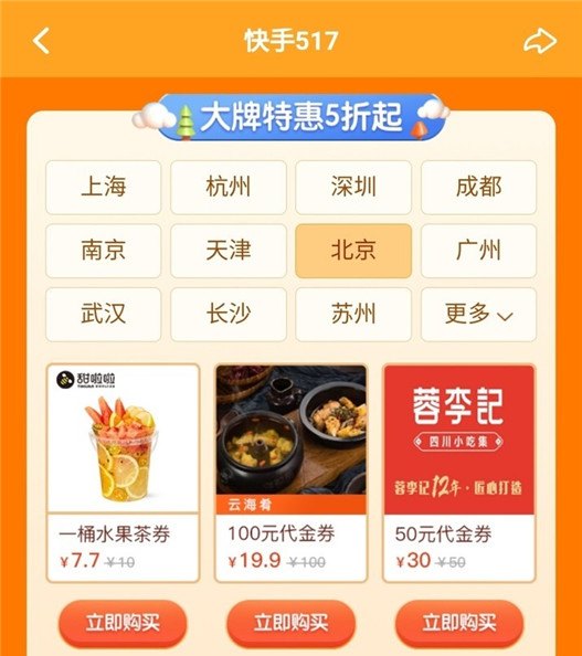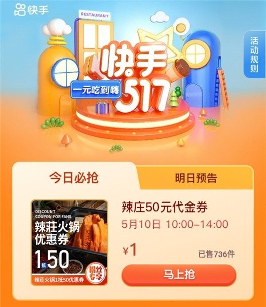 自5月10日起,上快手搜索“快手517”,即可進入活動頁面,結合所在區域篩選團購食品券,搶購一元特惠美食,更可根據預告蹲守諾爸、浪胃仙、阿浩、紅姐等快手美食達人直播間,對應搶購一元特惠大牌美食。同時,小甲同學、卷卷超愛吃、臘月小九等探店達人也將代替大家提前探店,享受美食,用戶戳探店視頻下方小黃車便可直接購買對應店鋪美食券,要種草也要真福利。