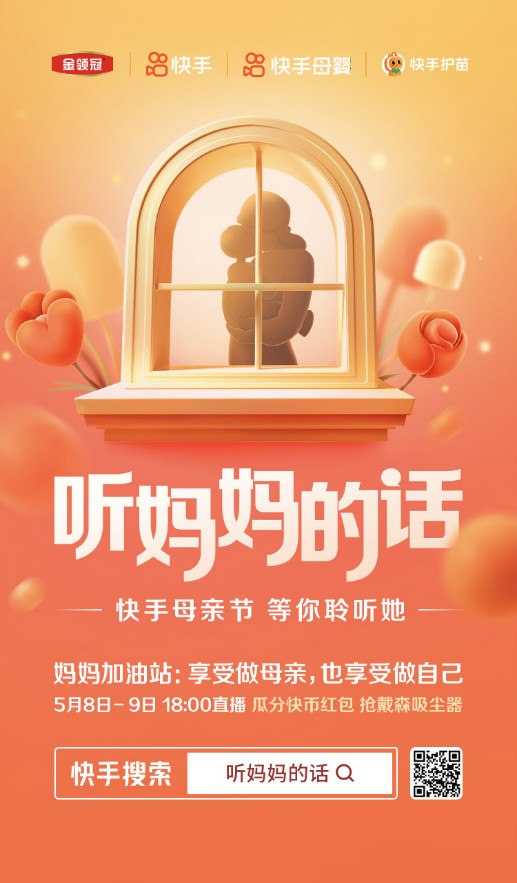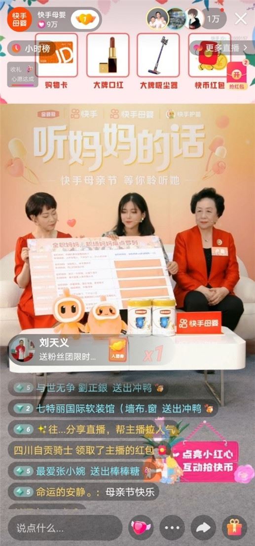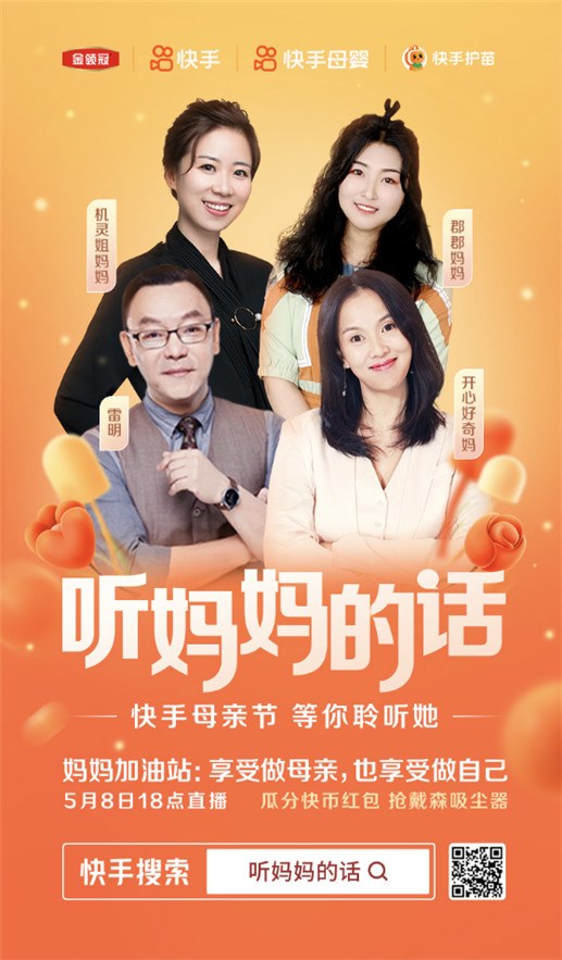 據(jù)了解,此次直播是快手母嬰關(guān)懷媽媽活動(dòng)周發(fā)起的訪談系列直播的第二場(chǎng)。5月1日至5月9日,快手啟動(dòng)母親節(jié)系列活動(dòng),并于5月8日和5月9日每晚18點(diǎn)連續(xù)推出兩場(chǎng)“聽媽媽的話”專題直播,由知名心理專家雷明等“育兒圈”頂流大咖,攜手開心好奇媽、機(jī)靈姐媽媽、郡郡媽媽組成的快手達(dá)人媽媽團(tuán),傾聽媽媽的聲音,聚焦隱形爸爸、隔代育兒、原生家庭等熱點(diǎn)議題,為寶爸寶媽們帶來科學(xué)育兒的專業(yè)建議。此外,直播間還為粉絲們準(zhǔn)備了京東購(gòu)物卡、戴森吸塵器、TF口紅等多重驚喜。
