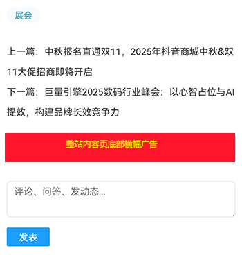 3 整站內容頁底部橫幅廣告(尺寸760*90):一鍵設置廣告、全智能化整站內容頁底部展示,覆蓋所有深度閱讀用戶群體;適合商品推廣、線索獲取、APP下載,電商購物等多種推廣目標;整站內容頁底部橫幅廣告:7600元/天,11900元/周,29300元/月,38000元/90天。