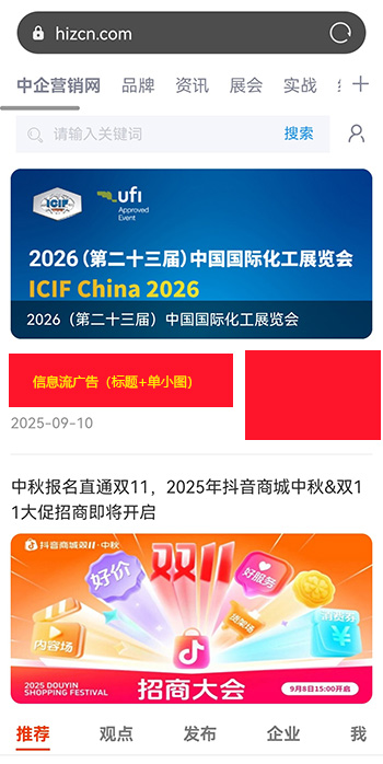 2 信息流廣告:內容即廣告,廣告展示在中企營銷網資訊流中,符合用戶閱讀習慣中實現營銷目標;手機端信息流廣告展現形式有4種:標題+單小圖、標題+三小圖、標題+大圖、純標題4種展現形式; 信息流廣告680元/篇,投放時間長期。