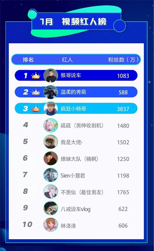 在7月視頻紅人榜中,猴哥說車躍居榜首,另一位汽車領(lǐng)域達人八戒說車vlog也出現(xiàn)在榜單中。值得一提的是,娛樂劇情類達人溫柔的秀菊、二次元達人Sien小慧君首次上榜。