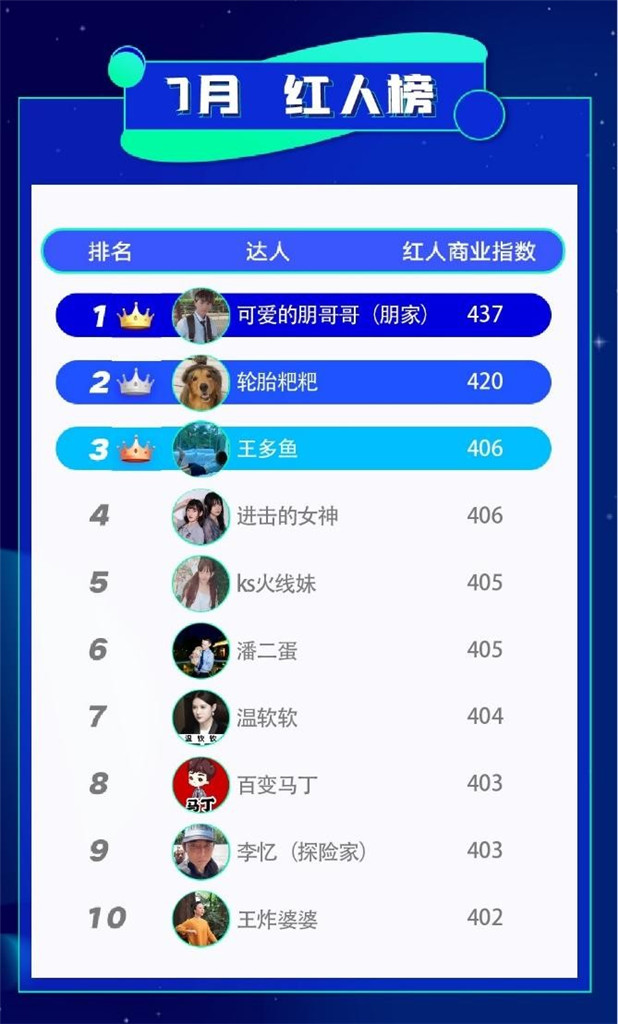 在紅人榜中,可愛的鵬哥哥(朋家)再次超過輪胎粑粑成為榜首,王多魚一躍成為第三名。此外,進擊的女神、潘二蛋、溫軟軟等多位劇情類達人上榜,海外領(lǐng)域創(chuàng)作者李憶(探險家)也進入榜單,彰顯了不同領(lǐng)域快手紅人的商業(yè)價值。