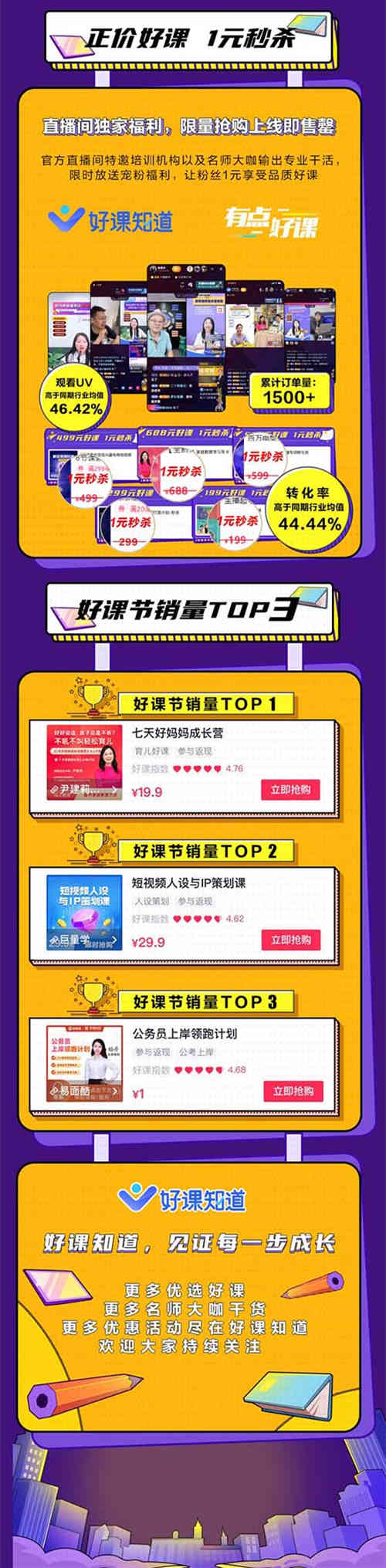玩法升級點二:以吸睛福利電商節IP,激活購買與口碑雙轉化。直播間之外,好課知道立足于教育廣告主品牌溝通訴求,通過電商“造節”新玩法,在暑期熱門節點推出818好課節,與廣告主、行業名師深度合作,結合定制化直播間內容,放大主題課程種草效果;繼而同步上線購課現金返現、直播秒殺等福利激勵活動,喚醒目標用戶學習需求,引導潛在用戶下單購買,進一步提升電商訂單轉化率。