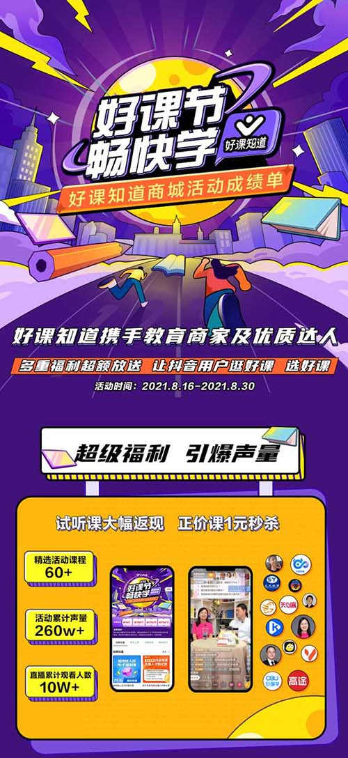 好課知道的出現,極大程度突破了教育電商化轉型瓶頸,幫助教育類廣告主以策略高效方案,激發生意新增長。作為聚集優質課程的教育垂類商城,好課知道第一、二期充分整合巨量引擎教育生態資源,打通線上教育課程優質售賣渠道。
