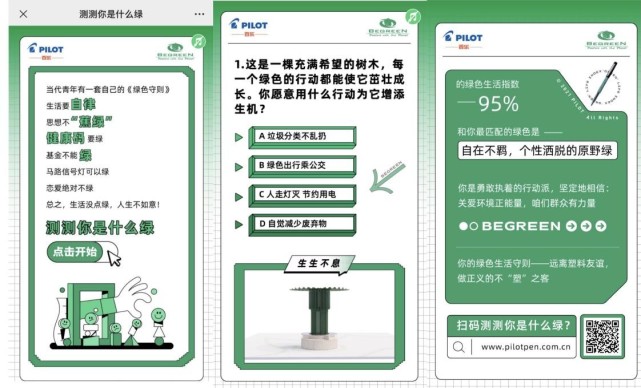 為增加藝術(shù)展的互動(dòng)性與趣味性,同時(shí)也便于無法親臨現(xiàn)場(chǎng)的用戶能沉浸式體驗(yàn)這場(chǎng)藝術(shù)盛宴,百樂推出《測(cè)測(cè)你是什么綠》趣味H5,抓住當(dāng)代年輕人“談綠色變”現(xiàn)象,用趣味方式釋放品牌信號(hào),宣揚(yáng)減少資源浪費(fèi)的行為,從源頭緩解環(huán)境問題。