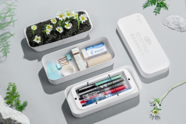 禮盒內(nèi)部還隨機(jī)搭配植物種子,內(nèi)托上寬下窄,填入土壤后便可搖身變成植物槽,百樂巧妙的設(shè)計(jì)讓廣大學(xué)子在綠色書寫的同時(shí)也能體驗(yàn)自然種植的樂趣。禮盒外殼采用原木漿與甘蔗漿的混合材質(zhì)制作,具有良好的可降解性,可以說「百樂新生禮盒」將“重塑新生”的理念貫徹到底。
