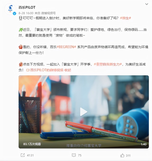 為配合本次開學(xué)季的傳播,百樂還聯(lián)合網(wǎng)易浪潮工作室打造一支科普短視頻,視頻以硬核的知識(shí)講解,讓大眾意識(shí)到關(guān)注環(huán)境,節(jié)能減塑的必要性和緊迫性,呼吁大眾加入關(guān)愛環(huán)境的行動(dòng)中,為關(guān)注環(huán)境事業(yè)貢獻(xiàn)出品牌力量。