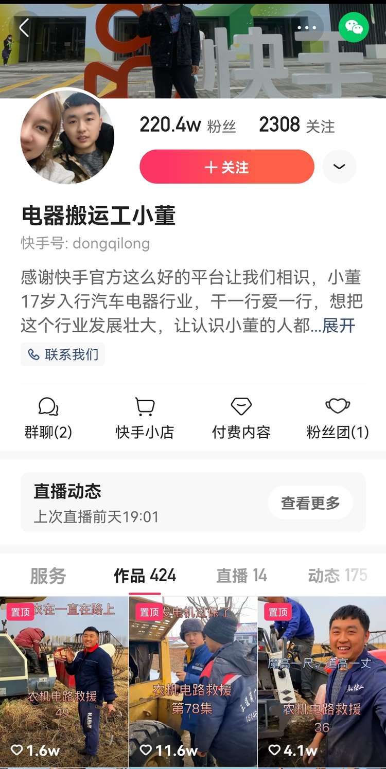 小董先從拍短視頻入手,但因為缺乏經驗,初期效果并不理想。“最開始就是發日常,隨便錄一錄我修車的生活,有時視頻突然上了熱門,點贊量很高,但關注的人很少,也不清楚原因。”好學的小董上專業剪輯班向其他直播學習,逐漸找到了門道,最終鎖定在自己最擅長的農機維修,一段時間之后,小董“教維修”讓賬號漲了12萬粉絲。后來小董還拍起了 “農機電路救援”“農機電路搶修”“農機電路通病”等系列短視頻來展示修車日常,目前已更新了一百多集。