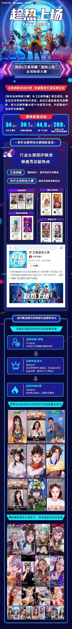 快手全民特效大賽與《王者榮耀》聯合發起,不僅集結了專業特效師創作競技,還有“商業化+游戲社區+特效平臺”資源整合。這場娛樂化全域事件在夏日為《王者榮耀》提供了30多億的內容播放量,吸引更多用戶參與到《王者榮耀》夏日“趁熱上場”活動中,更進一步強化了《王者榮耀》在快手平臺的內容生態體系。