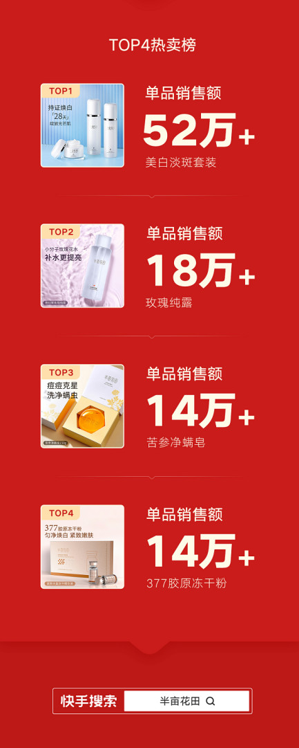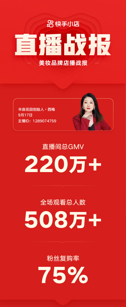 短視頻、直播電商等新興營銷方式正在重構上億用戶的消費決策,而品牌自播無疑是今年直播行業最熱的話題。自今年8月開始在快手正式布局自播以來,短短1個月間,國貨護膚品牌半畝花田粉絲數量迅速突破300萬。在前不久的品牌寵粉日活動中,半畝花田更是成績亮眼:全場總觀看人數超508萬,總GMV突破220萬,粉絲復購率達到75%,實現了品牌銷量和口碑的雙效轉化。