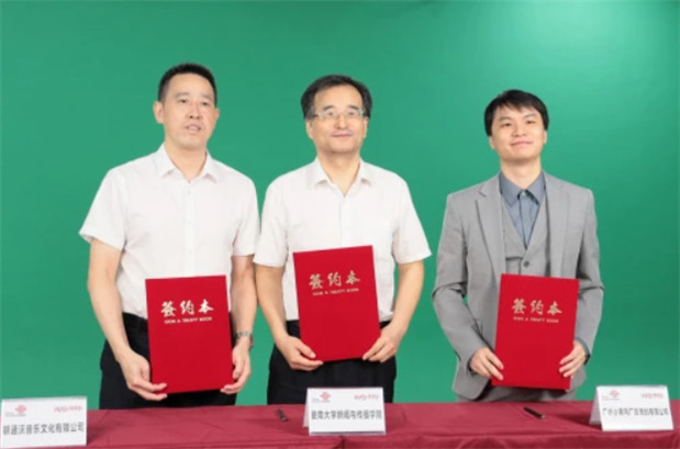 此次簽約儀式在聯通沃音樂5G·AI未來影像創作基地舉行,廣州小黃鴨廣告策劃公司總經理王東方,聯通在線沃音樂總經理李韓與暨南大學傳播與國家治理研究院院長、暨南大學新聞與傳播學院教授、博士生導師楊先順,及各自團隊代表共同出席了本次戰略簽約和揭牌儀式,并與現場參會嘉賓們共同體驗了最新的5G虛擬成像等前沿技術。