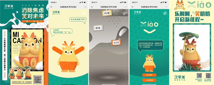 正值秋季開學(xué)季,新學(xué)期父母和孩子們難免焦慮迷茫。考慮到當(dāng)下“80后”“90后”家長的社交習(xí)慣,2平米借助微信平臺,用生動有趣的H5,以輕松快樂的方式引導(dǎo)用戶通過點擊消除“內(nèi)卷”“帶娃”“996”等焦慮詞匯,釋放自我,還可以上傳照片可以測試微笑元氣值,生成自帶精致格言的專屬海報。